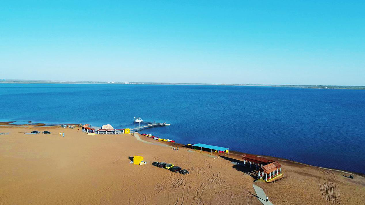 在榆林,这里有全国最大、风景最独特的沙漠淡水湖——红碱淖,在蒙古语中,淖是水泊、湖泊的意思,这里拥有最完美独特的塞外风光和蒙汉文化,在红碱淖东侧的尔林兔草原,这里水域辽阔,生态环境宜人,碧水黄沙在蓝天的辉映下美不胜收。