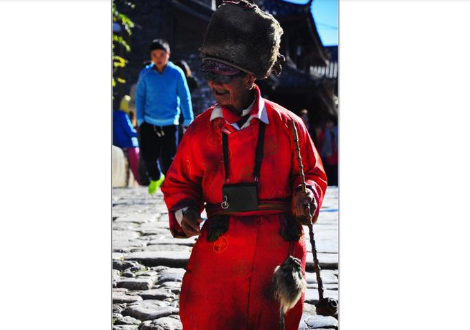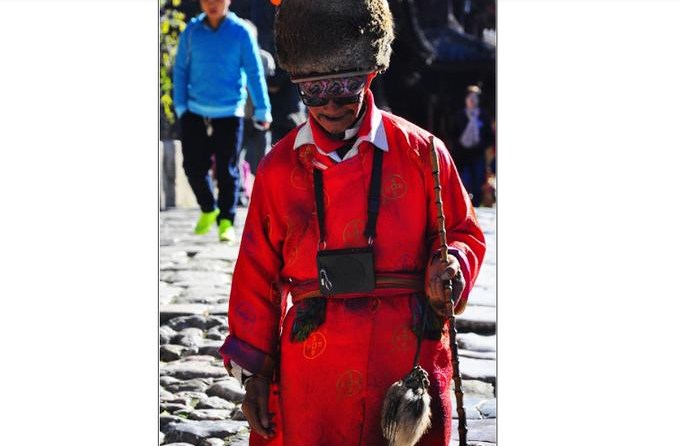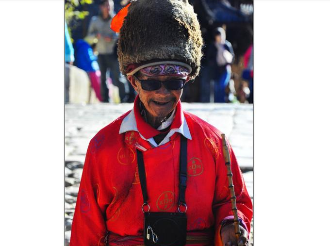 上午过半,月儿竟还没走,算是有了娇羞的意味。那位老爷子也“娇羞”,见我的镜头,想回避,还是被我用“连拍”模式留下了印象:大红的服装,带副墨镜,像是一位“民族术士”(事后作了沟通,还蛮健谈的)。