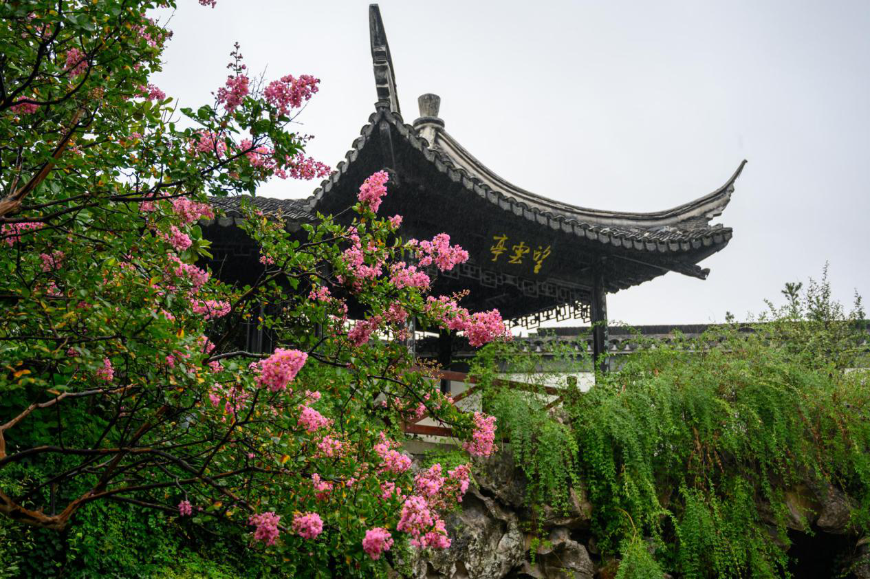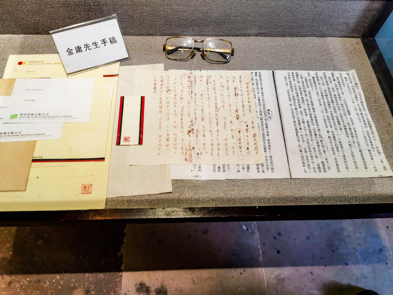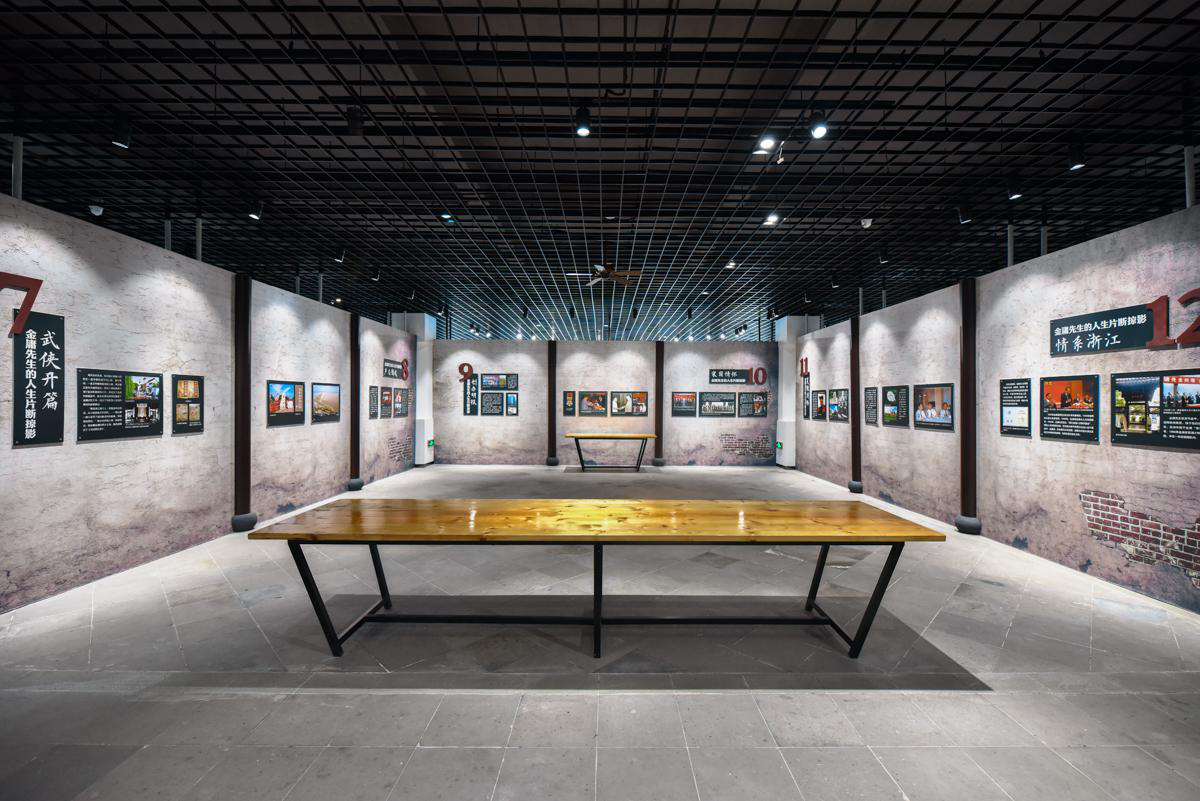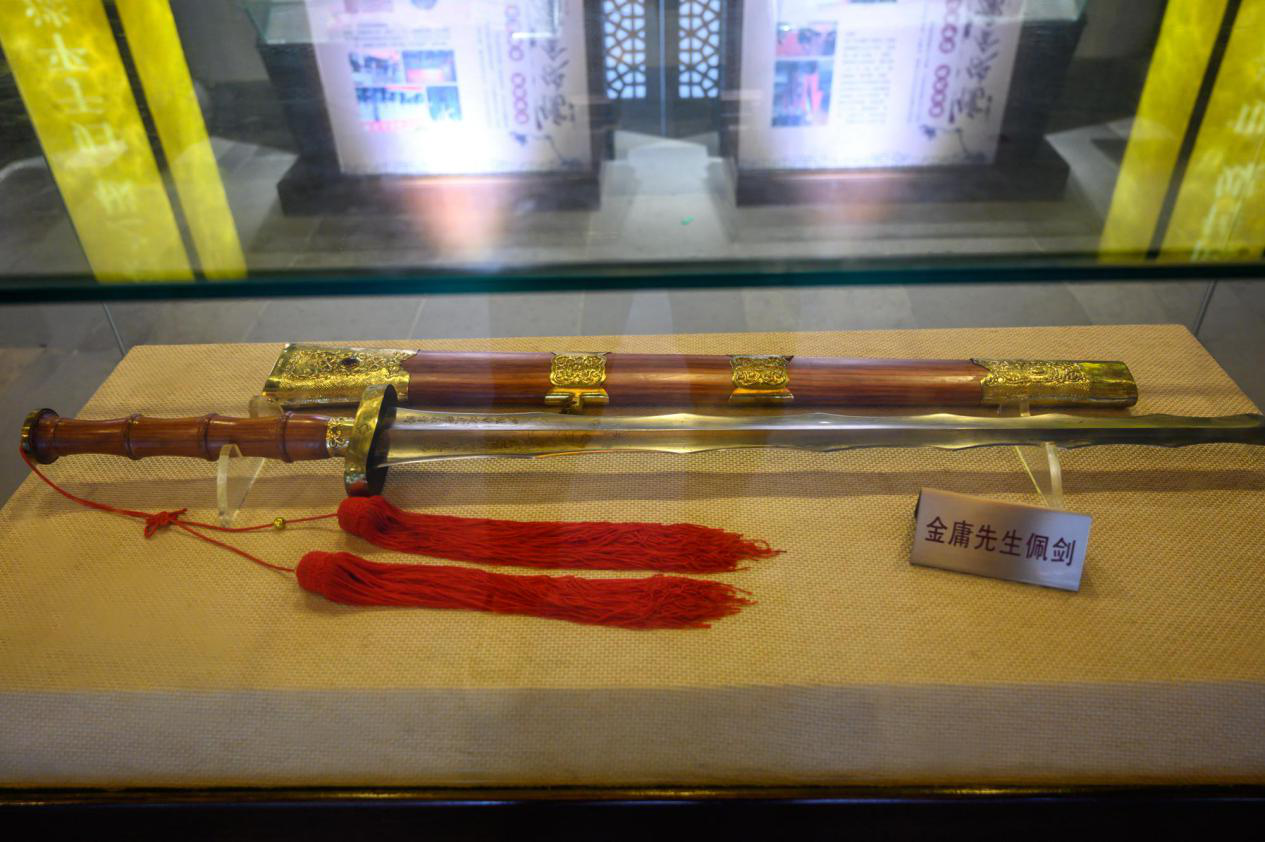 底楼展示的是金庸的成就“儒侠金庸陈列”,展厅正中的玻璃展柜里有金庸先生佩剑。展厅内四周设有展板,每个展板都附有柜体,既有文字说明,又有友人赠送的日文、韩文版金庸作品。印章展柜里收藏了“金庸书院”、“书剑堂”、“桃李门”等寿山石印章。二楼一排排木制的书柜里则收藏了金庸先生的著作。 望云亭