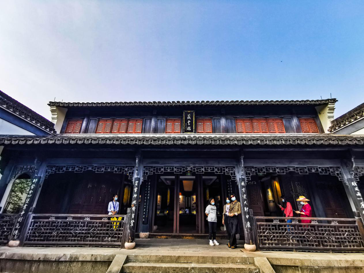 藏书楼是两层三开间,为书院藏书、检书、展示的场所。大门上雕刻着《书剑恩仇录》的一些情节。