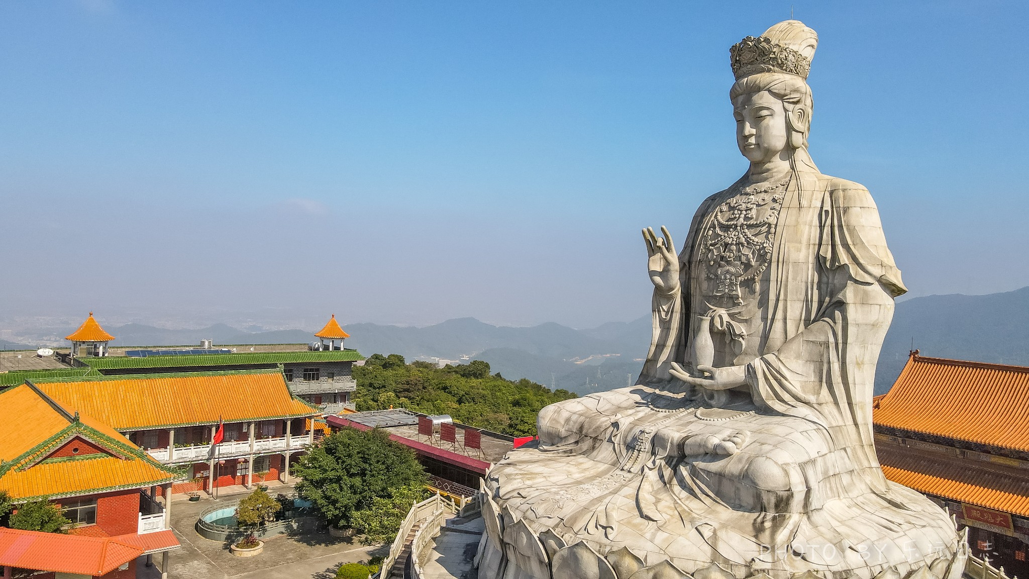 可惜由于疫情的影响,观音圣像区域暂时还未开放。因此乐玩君只能通过无人机再观摩一次这尊端庄威严的观音雕塑了。