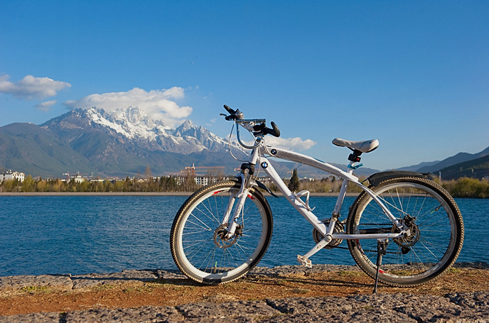 从客栈借了辆“宝马”自行车,向着雪玉雪山方向骑行,途经清溪水库