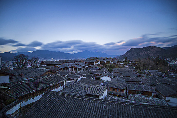 这家客栈应该是附近几家客栈中的住宿条件最好的,但位置不是最佳,所以放下行李后就去看日落了。客栈的二楼有个公共休闲区,是看日出日落的好地方。静静地坐着,看古城内的白墙灰瓦,远处的玉龙雪山,看光影变幻,云卷云舒。