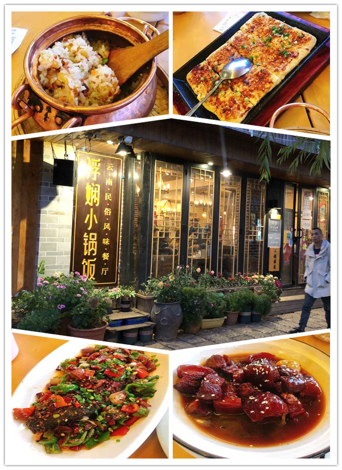 最后我们在束河古镇的飞水触花景点,也就是束河酒吧街旁边找到了一家临溪餐厅(门口有一条小溪)吃了晚餐,点了浮娴小锅饭,包浆豆腐,普洱红烧肉,纳西烤鱼这些丽江的特色美食,味道真的挺不错!价格不贵,到丽江值得常常!