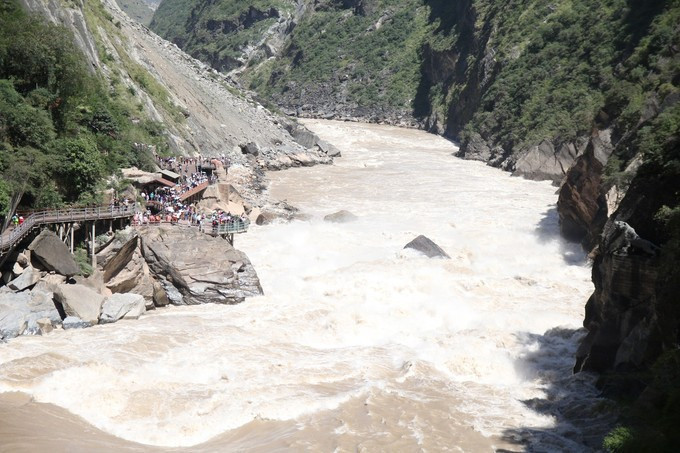 第二天出发我们先去了第一站,一个徒步俩小时的,只能在山上看水的入口,提醒大家千万不要走错,据说要去中虎跳,据说是个送分题,就这浪费了太多时间,而且无趣。于是我们就看着马路对面山崖上像停车场一样的堵车,想着俩小时后我们就是其中一员。但是其实往返的路途都没有太多塞车,反而是对面车流一直在塞车,幸运的是。 黄昏到了,晚上我们有一个藏民家访,带晚餐带表演的那种。吃得确实是大肉,表演没注意看,分菜的小哥们