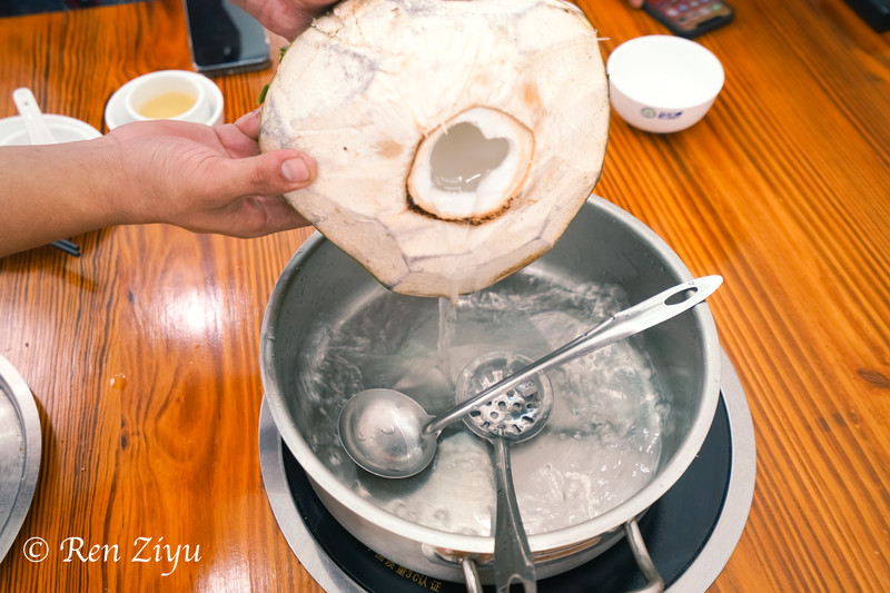 刚走进店里,服务员会给我介绍椰子鸡的肉很鲜嫩,都是采用新鲜的椰子水作为汤底,加入椰肉和枸杞,很营养的搭配了。 还有椰子鸡的灵魂硬菜文昌鸡,煮三分钟就可以吃了。文昌鸡的食材不错,优选散养的土鸡肉质滑嫩,虾滑也很新鲜。用鲜椰子水+文昌鸡做成的椰子鸡汤,一向是我的最爱。锅底不添加一滴水,只放三个鲜椰子水,因为纯的鲜椰汁最清甜。