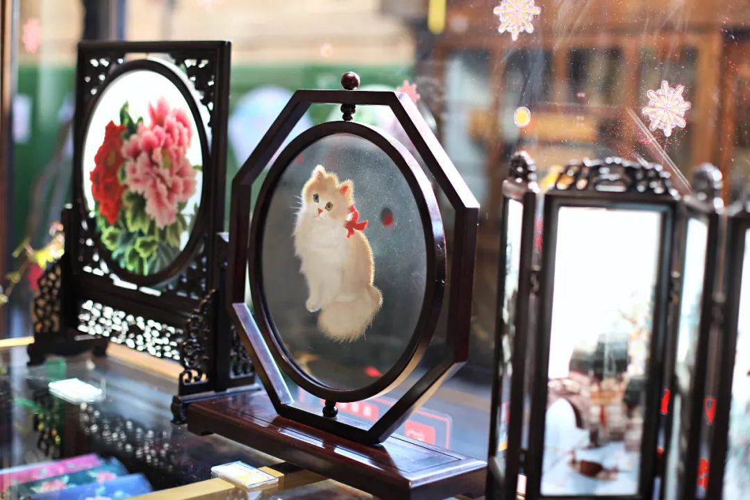 锦绣江南,当然离不开赫赫有名的苏绣了。在贞丰民俗文化街,还有一家绣艺坊。里面售卖大大小小的刺绣产品,也有展示绣娘是如何刺绣的。 绷布、绷架、苏针、花线,穿针走线后,一幅幅形象生动的绣品就诞生了。一针一线里,都是时光啊。