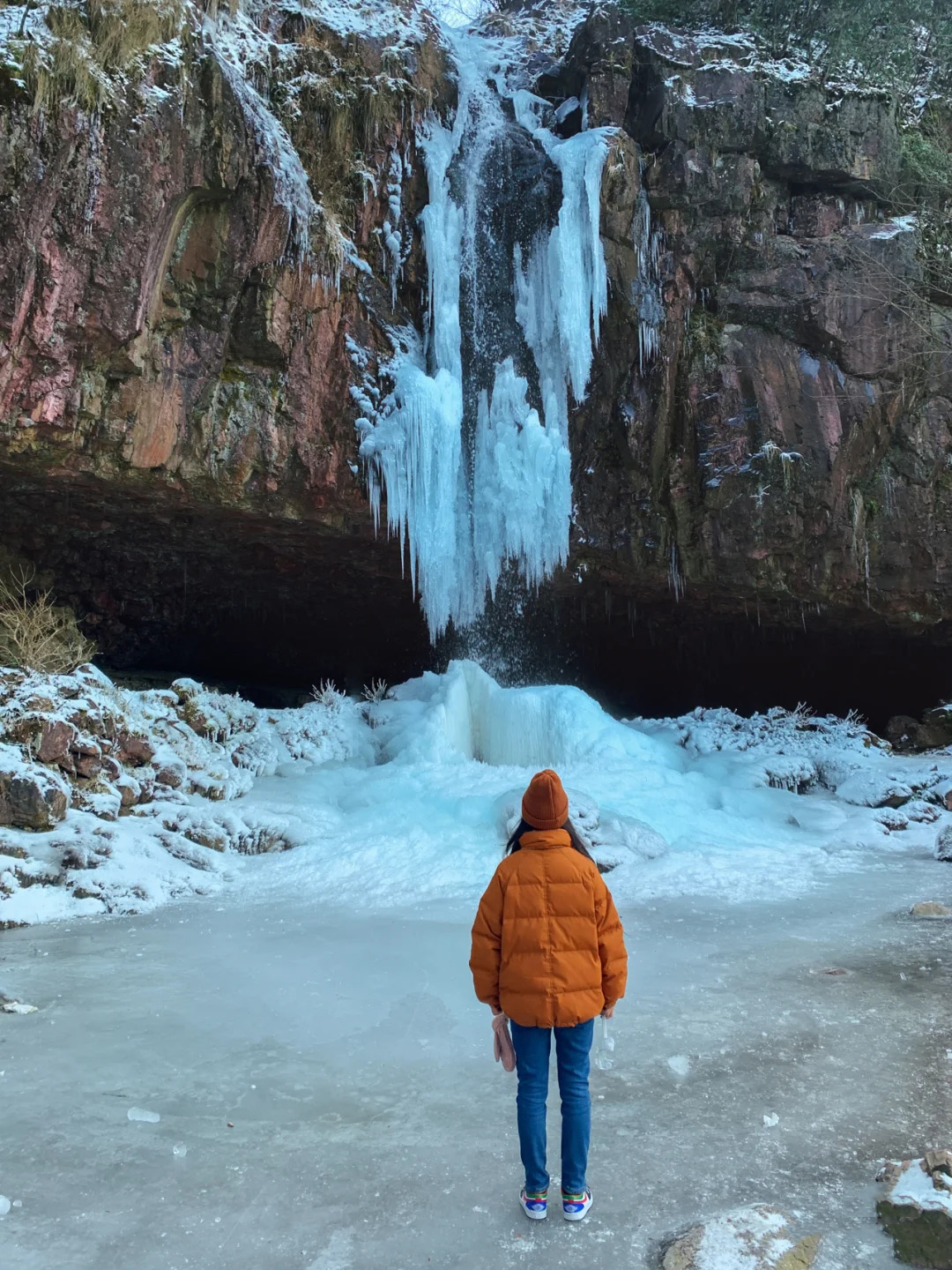 要看冰瀑需要穿过森林,走一大段路,在森林里拍照打卡也是绝美的。晶莹剔透的水晶冰柱、洁白如玉的冰锥悬挂在鹁鸪岩的洞口处,形成了一座天然的冰帘洞!