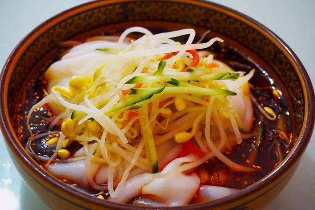最后,最容易让人们忽视的是各种种类的“面皮”,据记载在秦朝时期人们就开始食用面皮。陕西的面皮一般分为面皮和米皮两大类,多以酸辣味口为主。其中以宝鸡擀面皮、秦镇米皮、汉中热米皮最为有名。经过泡米、磨浆和蒸制等制作工序,擀面皮的口感较为筋道,米皮则口感软糯,再拌上特制的蒜水、辣椒油和酱油醋等配料,一碗碗色香味俱全的面皮就登场了。 看这个架势,想减肥的人来西安一定要慎重,但是说到底,又有谁不想来西安这个“馍都”把这些美食吃个遍呢?